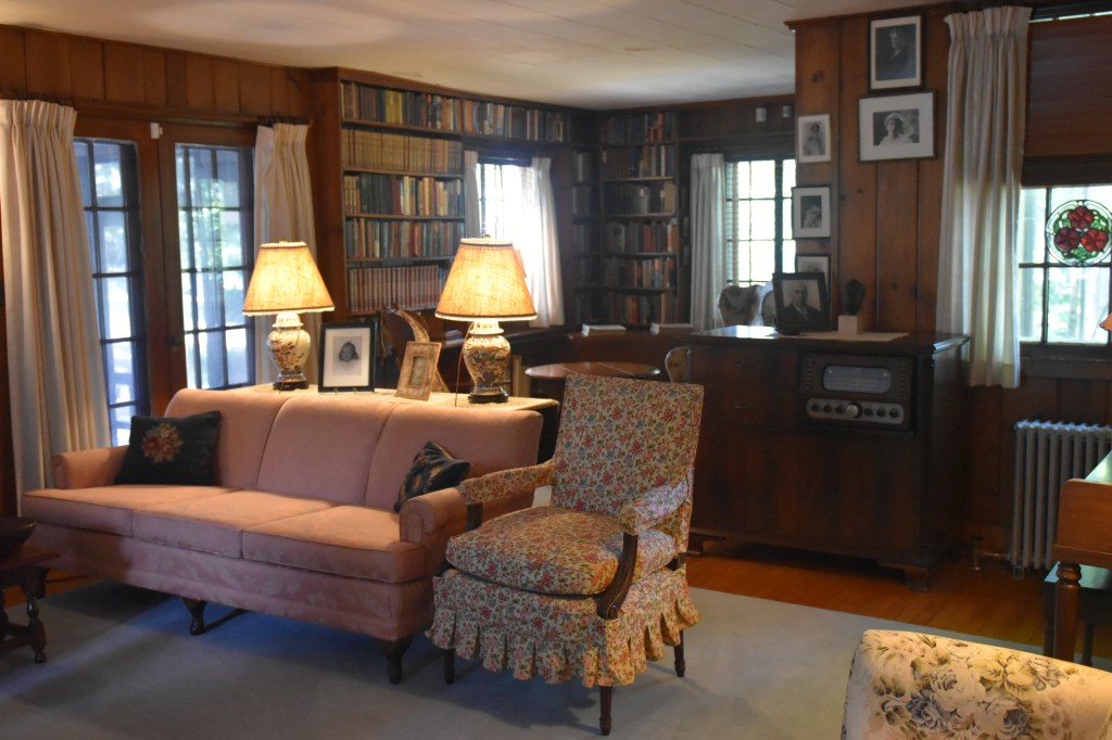 We arrived early Tuesday morning at FDR’s family home in Hyde Park and were in the first group tour of the property. Our guide was excellent and provided many historical details about FDR and his presidency. While FDR’s home was large and spacious, it was not grandiose by any means. The stone exterior, in my opinion, exuded the strength and character of the Roosevelt family. In the front room, there was a lot of navy memorabilia as well as a corner cabinet full of birds that Franklin had caught and studied as a child. The downstairs had a living room, dining room and to the far left, a large “family room” where Roosevelt often relaxed with family, friends and dignitaries. Before we went up to the second floor, our guide pointed out that the railing on the stairs had not only been touched by the Roosevelts but by their many guests including visiting kings, queens, and Prime Minister Churchill. The bedrooms were probably large for that day but not as large as one might expect given the importance of the guest who stayed there. The guide told us that the home was actually owned by FDR’s mother, Sara, who had her own bedroom close to the presidential couple. Eleanor had a small bedroom, next to Franklin’s bedroom. There was a third floor of the home which was for the children but there had been a fire many years ago in that part of the home and so it had been closed off and never reopened.