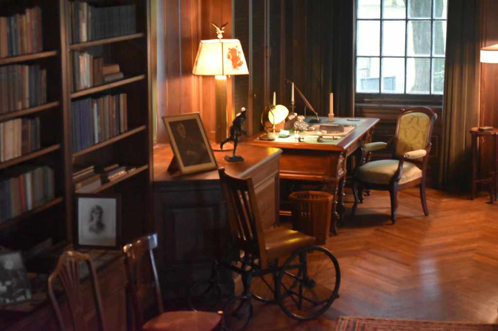 We learned that the home was actually owned by FDR’s mother, Sara Roosevelt, who had her own bedroom situated close to that of the presidential couple. Eleanor’s bedroom was modest, located next to Franklin’s. There was also a third floor intended for the children, but a fire many years ago damaged that section of the house, and it has remained closed and never reopened.
